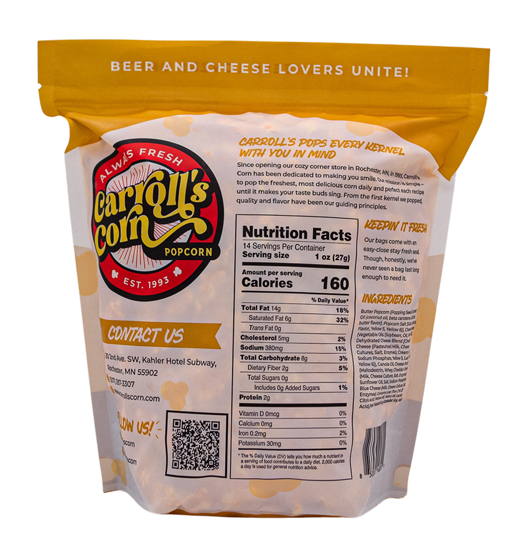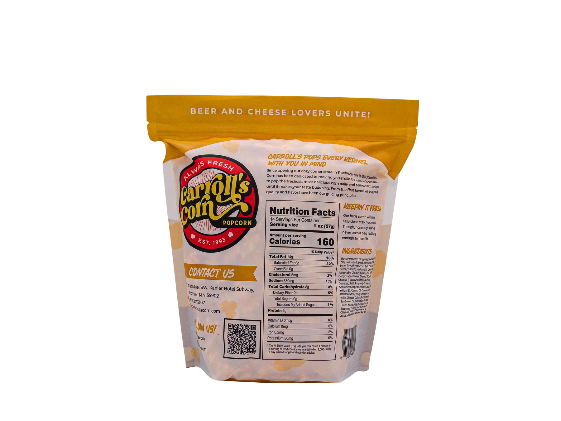 Beer and cheese lovers unite. Calling on our midwestern roots, this flavor mixes our classic cheese with the distinct flavor of beer for a delicious savory treat.