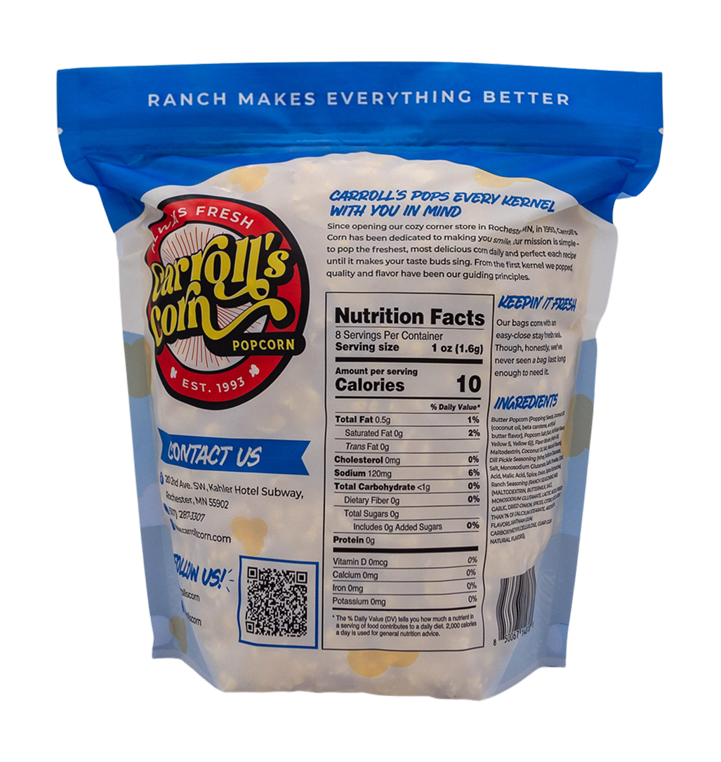 Get ready to tantalize your taste buds with a burst of zesty flavor in every bite. Our Ranch Popcorn is crafted with care using premium kernels popped to perfection, then generously coated with a savory blend of ranch seasoning.